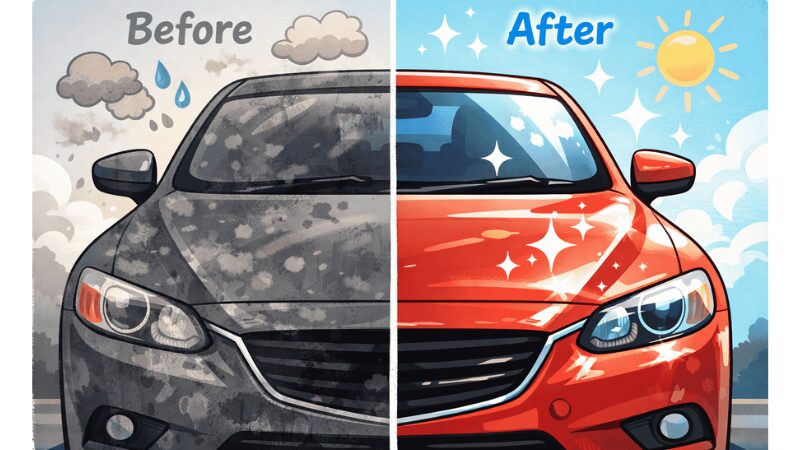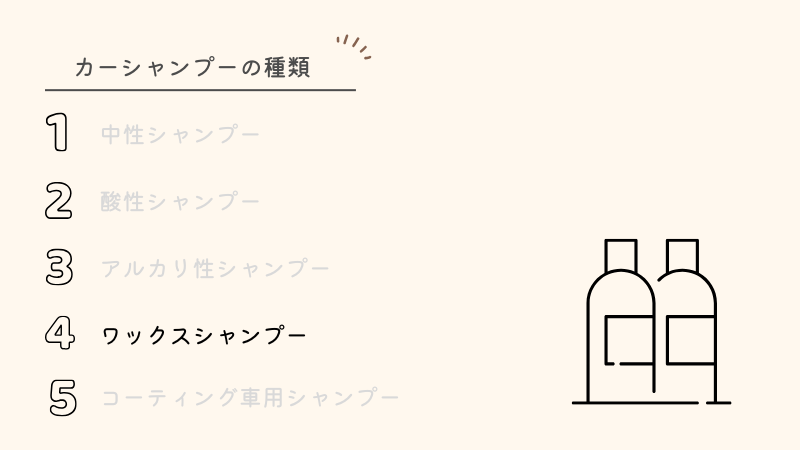 ワックスシャンプーは時間がないけどツヤと撥水を手軽に得たい人に最適です。一方で耐久性は低くシャンプーの洗浄力は低めというデメリットもあります。