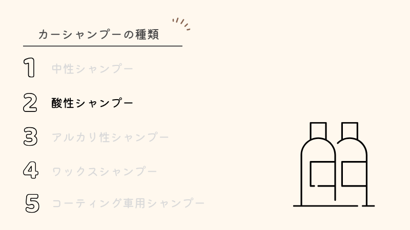 酸性シャンプーは、水ジミ(イオンデポジット)や頑固な汚れを分解する力が強いカーシャンプーです。通常の中性シャンプーでは落ちにくい汚れにアプローチできるのが特徴です。